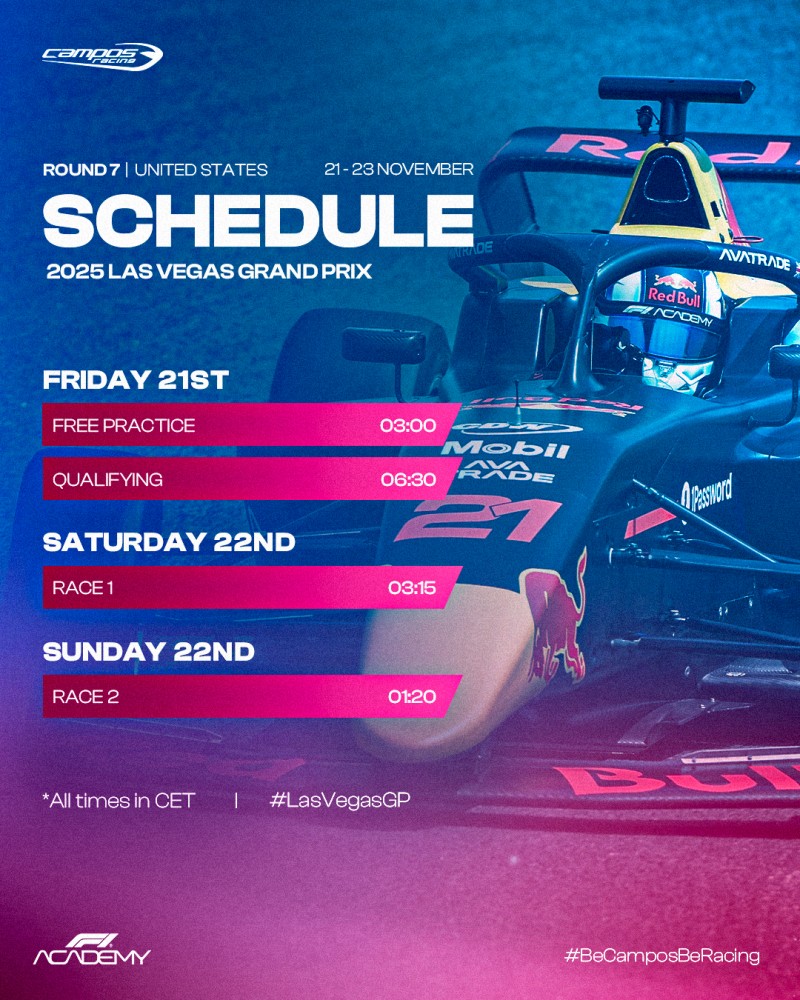 Adrián Campos (Team Principal de Campos Racing): “Queremos cerrar el año de F1 Academy a lo grande. Las Vegas será una novedad para todos, pero es un circuito bastante rápido, de velocidades medias altas y en el que los rebufos pueden ser extremadamente importantes. Buscaremos seguir asegurando nuestra presencia en el podio y acabar lo mejor que podamos tanto en la clasificación de pilotos como de equipos.”