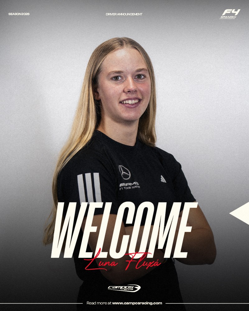 Campos Racing se complace en anunciar que la piloto Luna Fluxá se incorpora a la estructura del equipo de Alzira para disputar la próxima temporada 2026 de F4 Spain. Fluxá es el segundo anuncio de Campos Racing de cara al próximo año tras haber confirmado recientemente a Jacob Micallef.