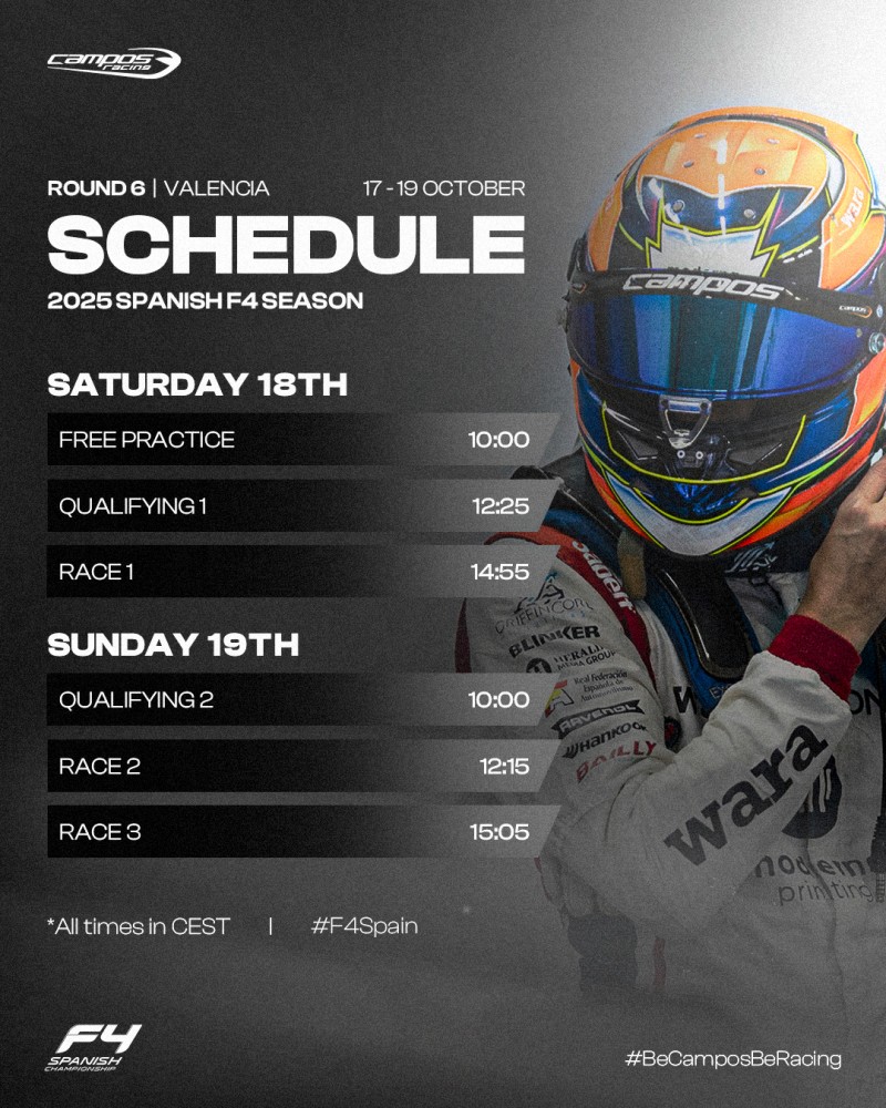 Adrián Campos (Team Principal de Campos Racing): “Correr en casa siempre supone una motivación extra para todos. Estamos completando una gran temporada 2025 en F4 Spain y queremos seguir en la misma línea en Valencia. Es un circuito que conocemos perfectamente, pero en el que las diferencias son siempre pequeñas y más en una categoría de la igualdad del de la F4 española. Vamos con mucha ilusión de sumar los puntos necesarios para acercarnos un paso más a los títulos, tanto de pilotos como de equipos.”
