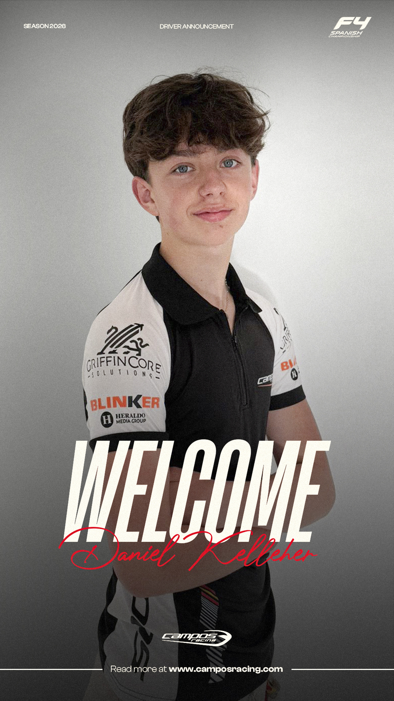 Campos Racing se complace en poder anunciar que Daniel Kelleher estará al volante de uno de sus monoplazas Tatuus a lo largo de la próxima temporada 2026 de F4 Spain. Kelleher se une así a Jacob Micallef y Luna Fluxá, que también competirán bajo el nombre de Campos Racing; mientras, Vivek Kanthan, cuya confirmación se ha producido recientemente, lo hará con los colores de Griffin Core by Campos.